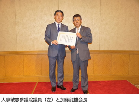平成28年5月30日、本連盟は、ホテルオークラ福岡(福岡市博多区)において、参議院議員選挙(7月10日投開票)候補者である現職の大家敏志氏へ推薦状を交付しました。大家候補に対する推薦については、昨年8月27日の幹事会・総財委員会合同会議において決議しました。