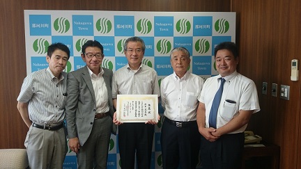 平成28年8月8日、本連盟筑紫ブロック(青山博秋ブロック長)は、那珂川町長選挙へ立候補を予定している現職の武末茂喜氏へ推薦状を交付しました。武末候補に対する推薦については、選挙期日が迫っており、組織運営委員による緊急対応において決議し、幹事会へ報告することとしています。